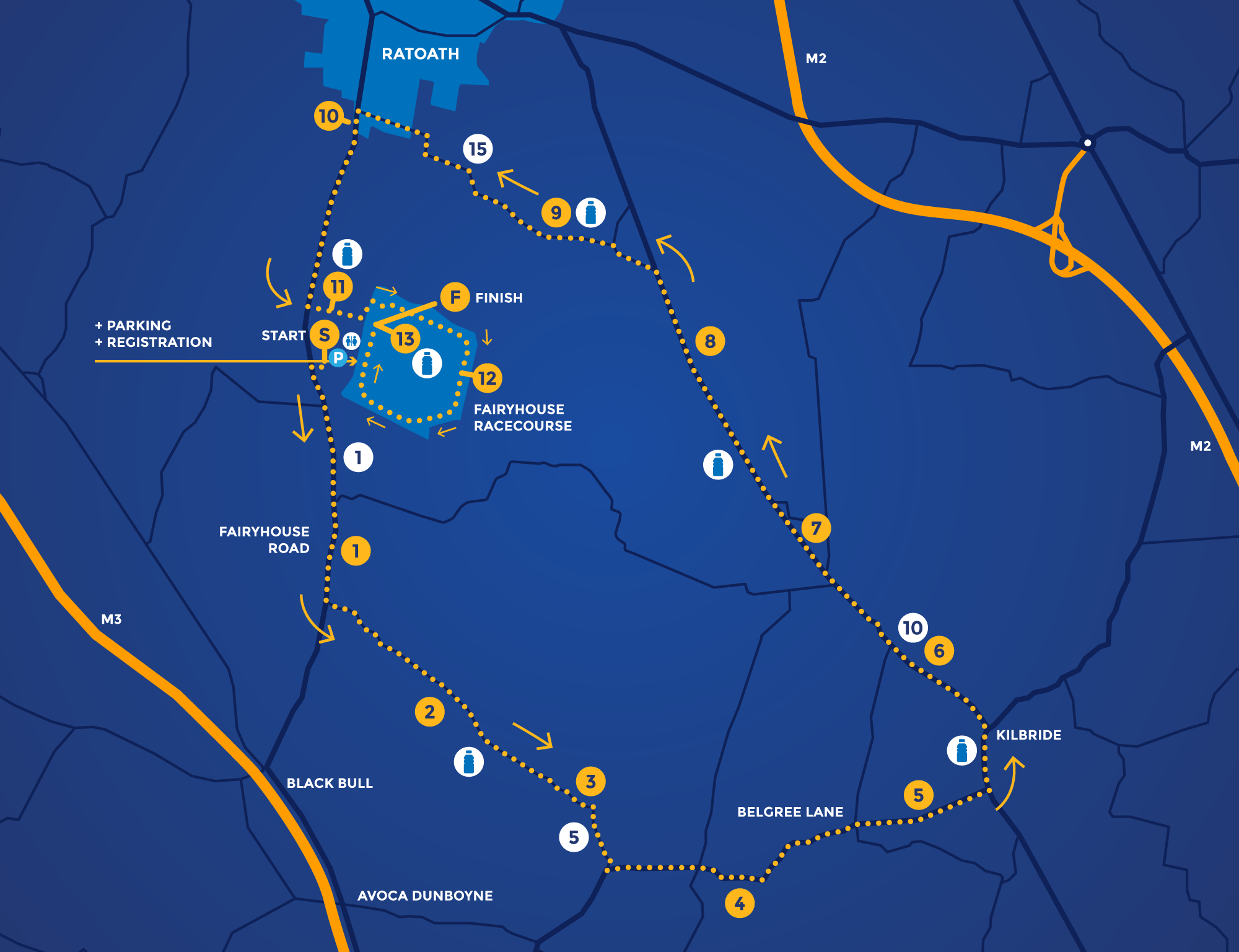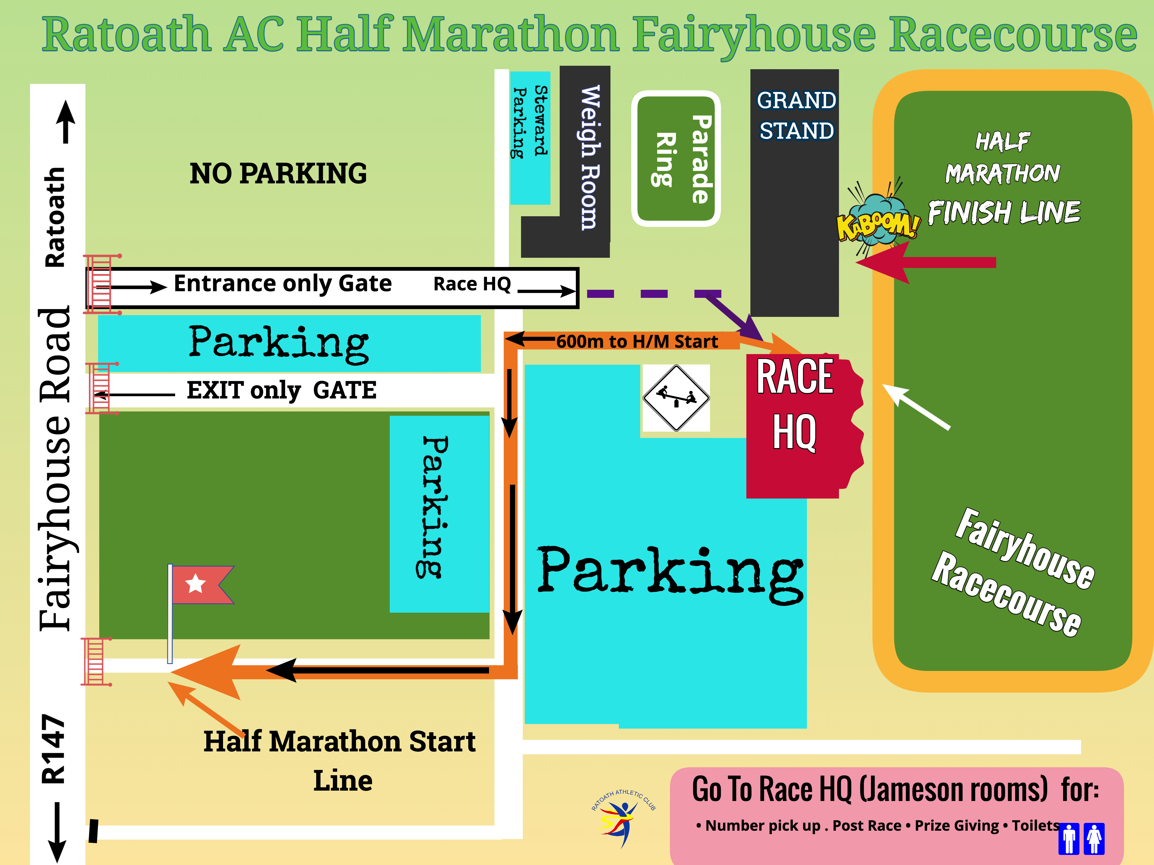 Our Half Marathon starts at the entrance to Fairyhouse Race Course then left out onto the flat roads of County Meath showcasing a Fast, Flat & PB focused course for participants while finishing with one lap of Fairyhouse race course and then a sprint finish under the finish line in front of the Iconic Fairyhouse Grandstand.
